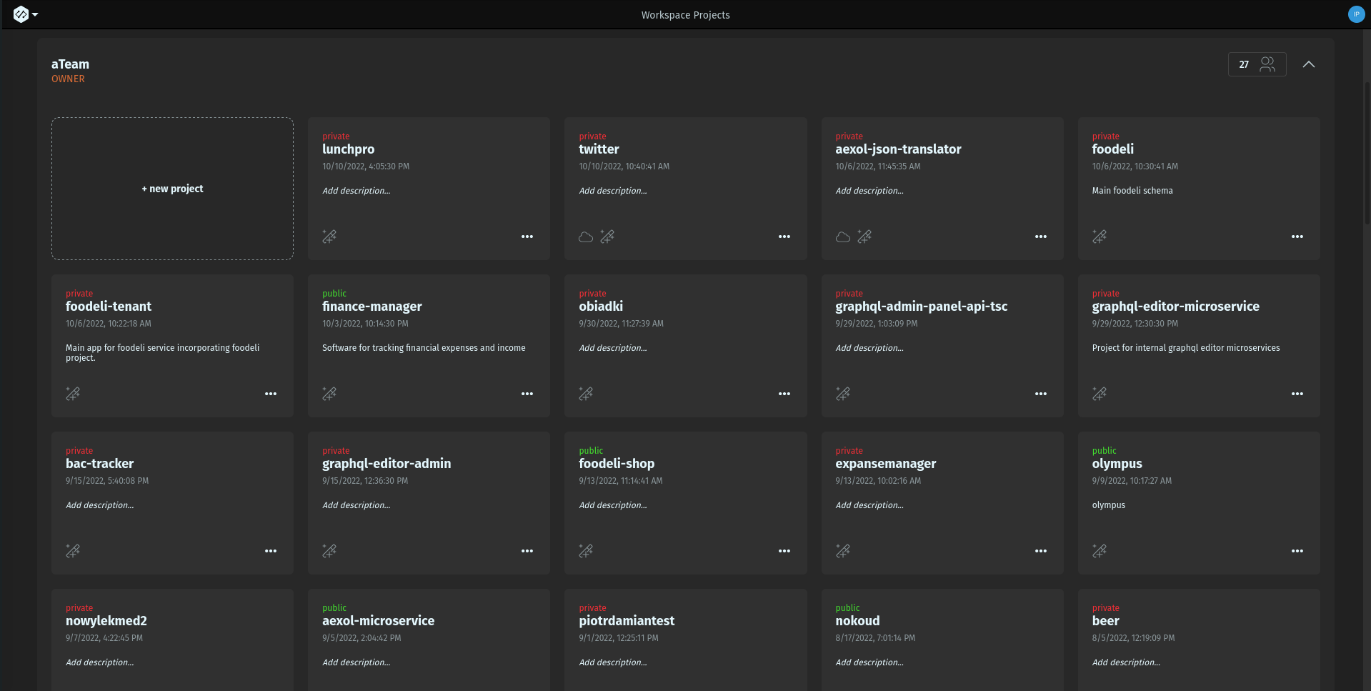 Workspaces are used to organize projects. Each workspace consists of all the workspace members invited to it, and their projects.
